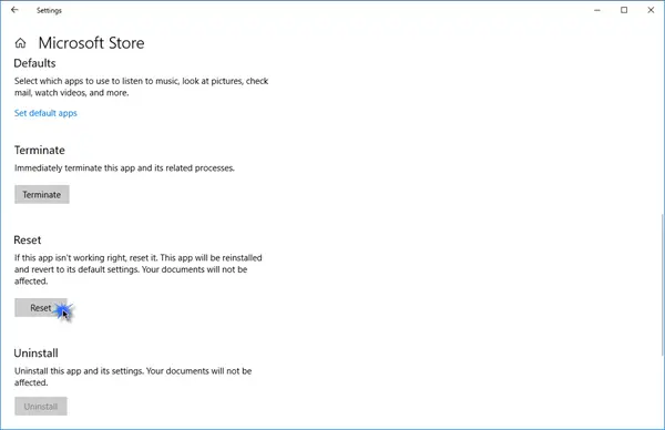 Here you lot can click on the Reset button. This will reinstall the Microsoft Windows Shop app and change all settings to their default value.